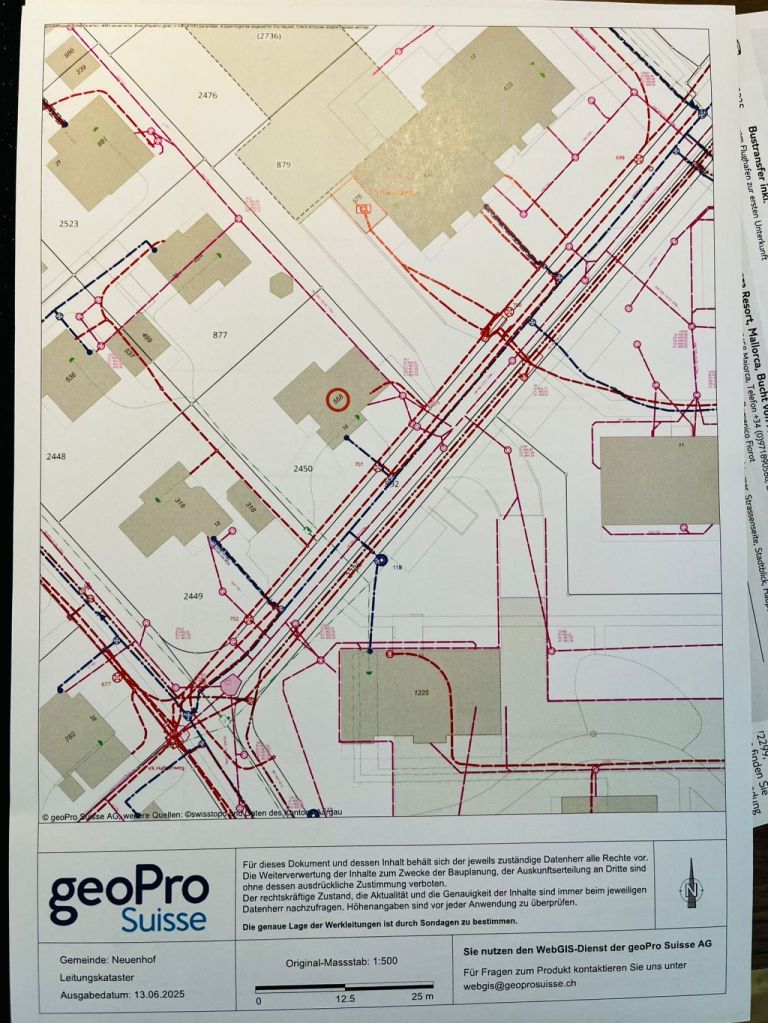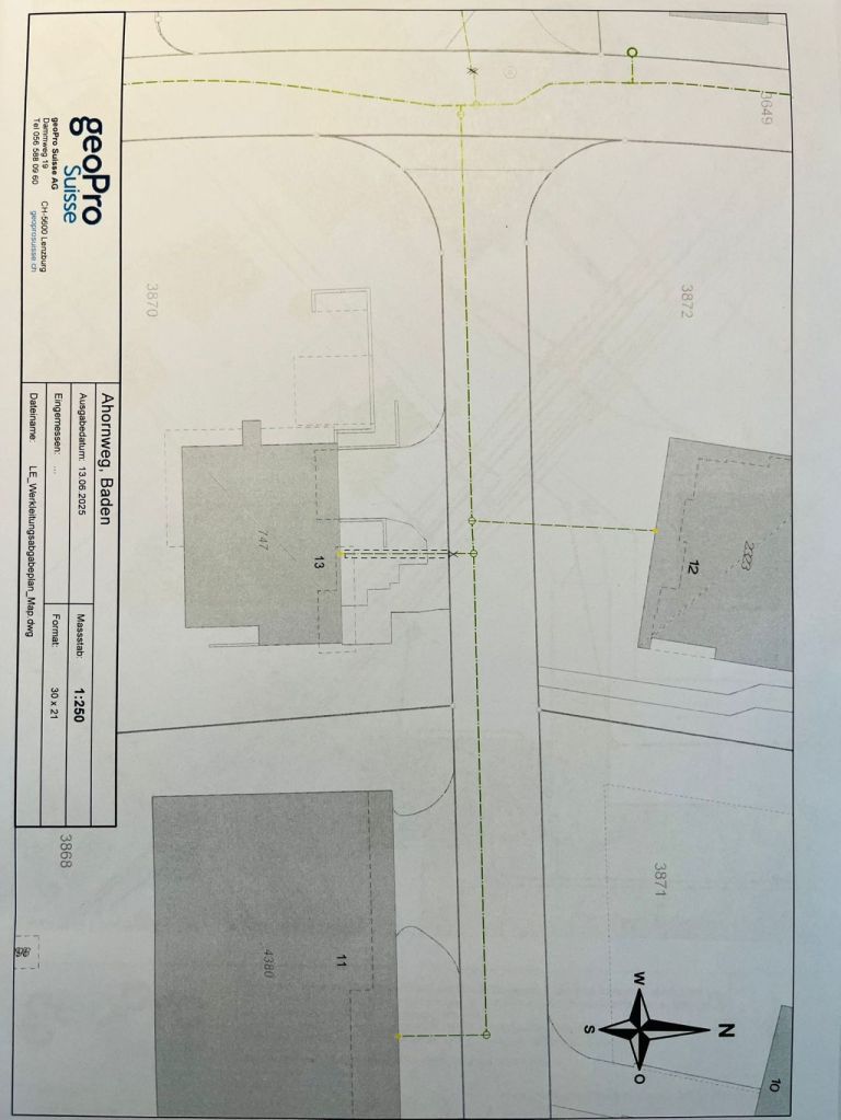 Am Nachmittag fuhr ich mit Daniel Schiess zum Standort in Lenzburg, wo mir das Team vorgestellt wurde. 👩💼👨💼Das Büro in Lenzburg ähnelt dem in Baden sehr. 🏢 Ich durfte bei einem kleinen Auftrag mitkommen, bei dem wir die Position von Stromleitungen bestimmten. Beim Auftrag erklärte mir einer von Lenzburg, dass die Leitungen sichtbar sein sollten, wenn sie eintreffen und sie fotografieren die Leitungen immer damit jemand, der es nach Jahren ansieht, sich vorstellen kann wie es aussah. 📸 Zum Schluss durfte ich anhand eines Musterplans verschiedene Leitungen (Hauptleitung, Hausanschluss, Schieber etc.) in AutoCAD Map 3D mit korrekten Koordinaten und Massen platzieren. 📐🖌️